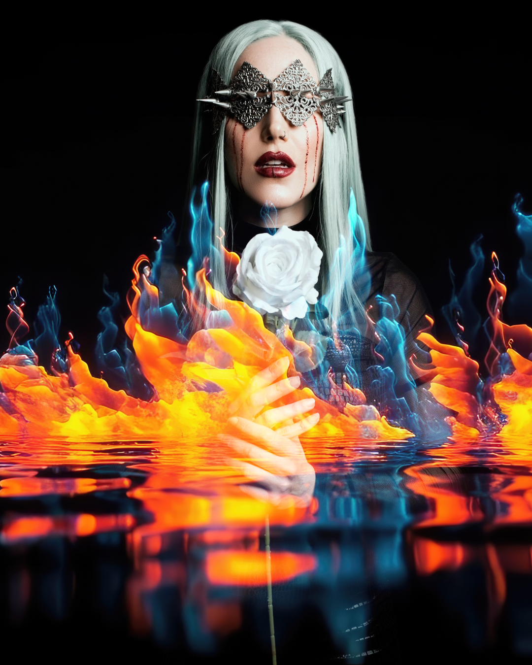 Flame presses inward from the world itself. Expectation, scrutiny, opposition, and pressure arrive uninvited. The subject does not ignite the fire. She stands within it. Survival is the first declaration.