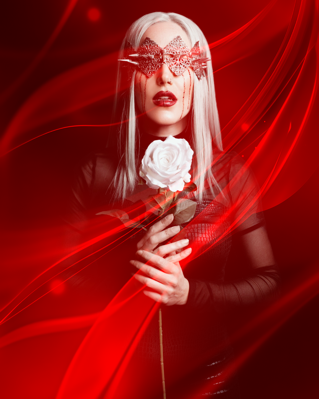 The flowing red effects move like silk caught in a storm, elegant and dangerous at once. They wrap the composition without consuming her, suggesting devotion, obsession, passion, and sacrifice all bound together. This is not chaos. It is fervor given shape.