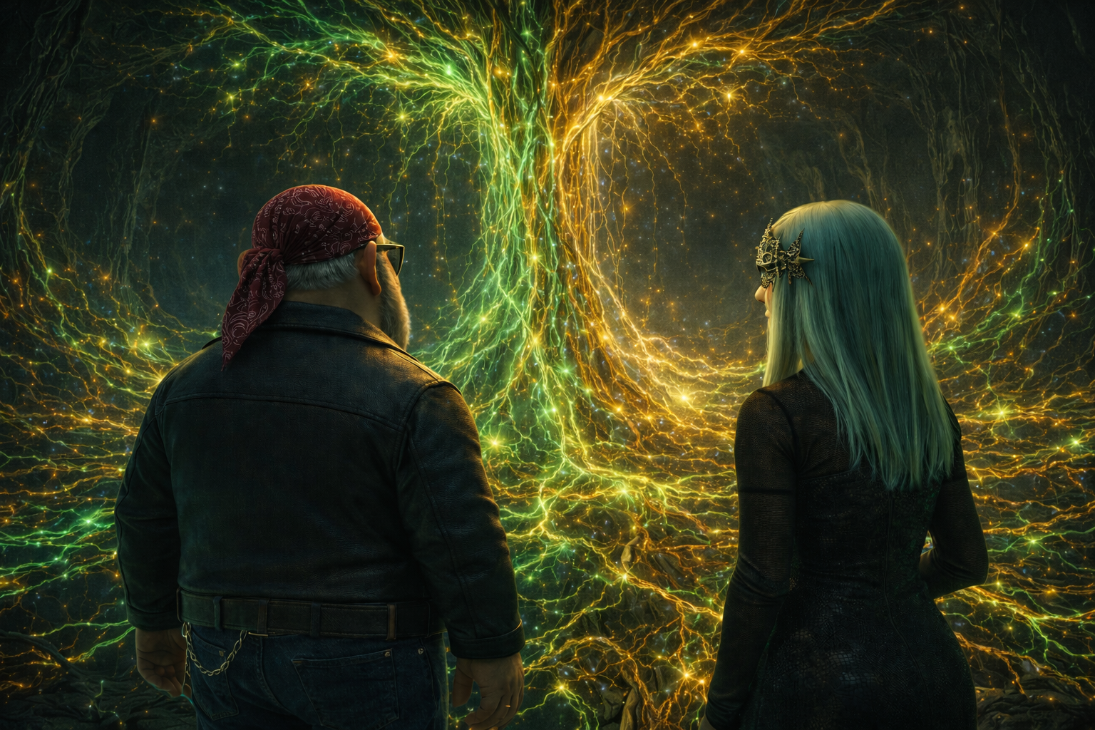 They stepped into a vastness that felt less excavated and more revealed, as if the mine had peeled reality back to something foundational. The emerald glow was gone now, replaced by something wilder. A lattice of neon roots spread in every direction, branching, intertwining, pulsing with slow intelligence.